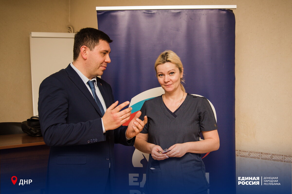 В преддверии Нового года партийные ряды пополнились людьми, которые стоят на страже здоровья детей Республики. Партийные билеты сотрудникам Республиканской клинической детской больницы торжественно вручил депутат Народного Совета ДНР Сергей Ярош. (https://vk.com/mr.yarosh)