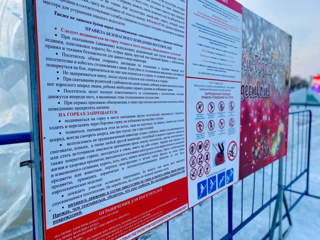 Служба по обеспечению деятельности органов местного самоуправления напомнила посетителям ледового городка о правилах его посещения. Настоятельные рекомендации уже транслируются на уличном экране на площади им. 30-летия Победы, размещены на специальных информерах у горок. - Ледовый городок откроется вечером 29 декабря, однако о правилах его посещения решили напомнить заблаговременно, – говорит руководитель Службы ДОМС Татьяна Басос. - Действовать правила для посетителей в целях соблюдения правил безопасности, исключения причинения вреда здоровью и имуществу посетителей будут до самого завершения его работы. В случае нарушения ответственность ложится на лицо, нарушившее их. Действует запрет на катание детей младше 6 лет без сопровождающих взрослых. Каждый сам определяет степень опасности и несет ответственность за своего ребенка. Посетителей новогоднего городка просят, в случае обнаружения на горках или скульптурах какого-либо дефекта, который может причинить вред детям, сразу же сообщит