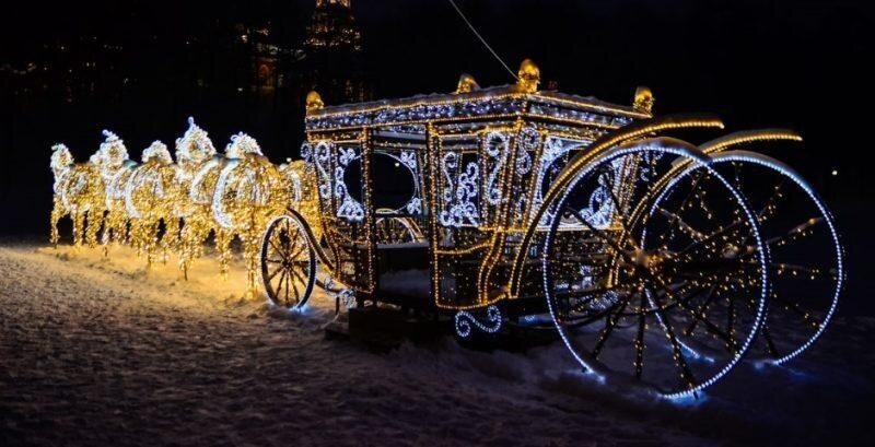 На аллеях и площадях установили канделябры и световые тоннели, световые инсталляции – карета, кабриолет, трон, корона, держава, царь-пушка, царь-колокол и громадный елочный шар. У Фигурного моста в самой популярной точке для селфи поставлена мерцающая фоторамка.