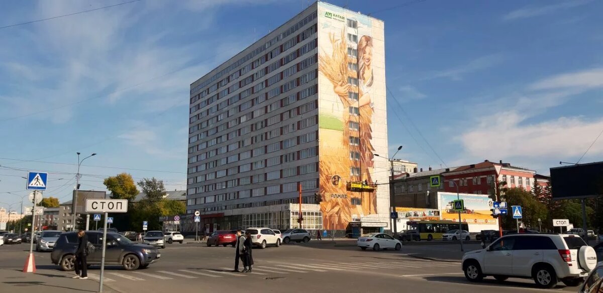 Торец здания расписали изображением девушки со снопом пшеницы. Эскиз росписи разработан барнаульским художником Иваном Ильющенко. Образ девушки в поле собирательный, хлеб – один из символов Алтайского края, сочетающийся с профилем Аграрного университета, которому в этом году исполнилось 80 лет.