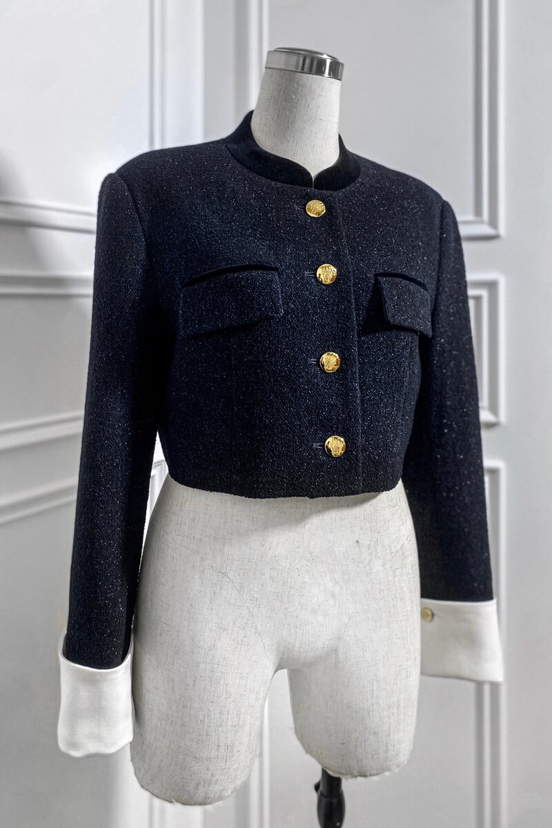 Жакет в стиле Saint Laurent выполнен из букле темно-синего цвета с вкраплениями сияющих нитей от итальянской компании Grosber. Дополнен металлическими пуговицами Zegna золотого цвета с гравировкой в виде герба. Наши люкс-ателье:
