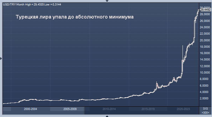Нацвалюта и облигации падают, поскольку повышение минимальной заработной платы усиливает опасения по поводу инфляции График доллара США к турецкой лире интервалами в 1 неделю Государственные облигации Турции и лира упали после повышения минимальной заработной платы на 49%, которое, как ожидается, будет способствовать новому витку спирали инфляции. Правительство повысило чистую минимальную заработную плату на 2024 год до 17 002 лир (578 долларов США), чтобы снизить стоимость жизни. Это верхняя граница диапазона 40-50%, который, по словам Goldman Sachs Group Inc. и Morgan Stanley, может привести к дальнейшему ужесточению денежно-кредитной политики центральным банком. Доходность двухлетних государственных облигаций Турции подскочила на 62 базисных пункта, а доходность 10-летних облигаций в лирах выросла на 19 базисных пунктов. Лира упала на 0,2% и торговалась на уровне 29,4509 за доллар США. Валюта потеряла 36,5% по отношению к доллару в этом году, что делает ее второй худшей валютой разв