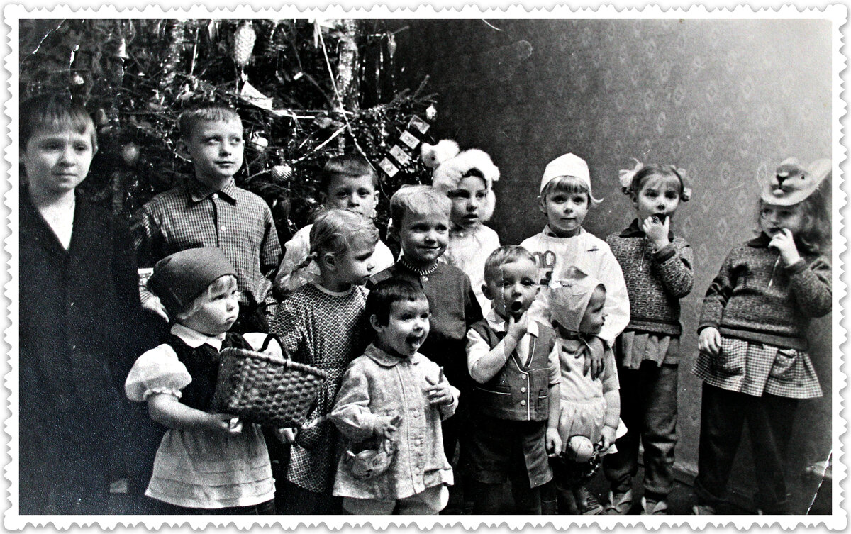 Шёл декабрь 1964 года. В Ломоносовском районе Ленинградской области посёлку городского типа Сосновый Бор исполнилось шесть лет. Довольно малый возраст для населённого пункта, можно сказать — колыбельный. Но будущий город, а станет он им в 1973, быстро вырастал. Воздвигались новые дома, появлялись новые улицы. Росло и его население. Особенно детское. Правда детских садов и яслей хватало тогда не на всех. А потому многие родители устраивали для своих и соседских детей домашние новогодние утренники. С хороводами, песнями и подарками. Всем было очень весело. А как же иначе, ведь Новый год — это всегда волшебство. Волшебство, которое навсегда останется в нашей памяти. И как подтверждение тому, этот снимок из далёкого 1964 года. Здесь тот самый домашний новогодний утренник, что проходил в одной из квартир дома №21-А по улице Комсомольской. Трёх ребят на фото я хорошо помню. Это Серёжа Т, его брат Витя и Андрей Д. Остальные имена стёрлись из памяти. Было бы здорово, если присутствующие на фо