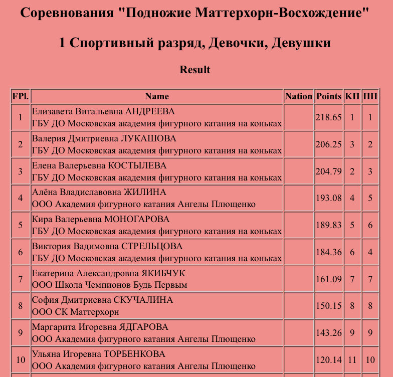 В последние дни декабря на МИЦ арене в Москве проходят соревнования с красивым названием «Подножие Маттерхорн - Восхождение». По 1 спортивному разряду выступает сразу несколько очень сильных фигуристок, что и подтверждают баллы. 🥇Елизавета Андреева (Этери Тутберидзе) вновь в короткой программе исполнила сложнейший каскад тройной аксель-тройной тулуп. И так уверено и легко, будто это дупель. Сольный тройной лутц и двойной аксель тоже очень хорошо! Не могу не отметить и шикарные Лизины вращения. Рада, что судьи оценили по достоинству — 78.16. В произвольной программе Лиза пошла на два трикселя и оба прыжка покорились. Первый 3А был в секвенции с дуплем, второй сольный. Очень рада за Лизу! Стабилизирует свой триксель и улучшает результаты старт за стартом. Обожаю ее программу «Король Лев». Львица сегодня была на высоте! 140.49, 218.65. Жаль, что Лиза в этом году по возрасту не прошла на юниорские этапы. 🥈Валерия Лукашова (Этери Тутберидзе). Как же я рада за Леру. 2 чистых проката и уве