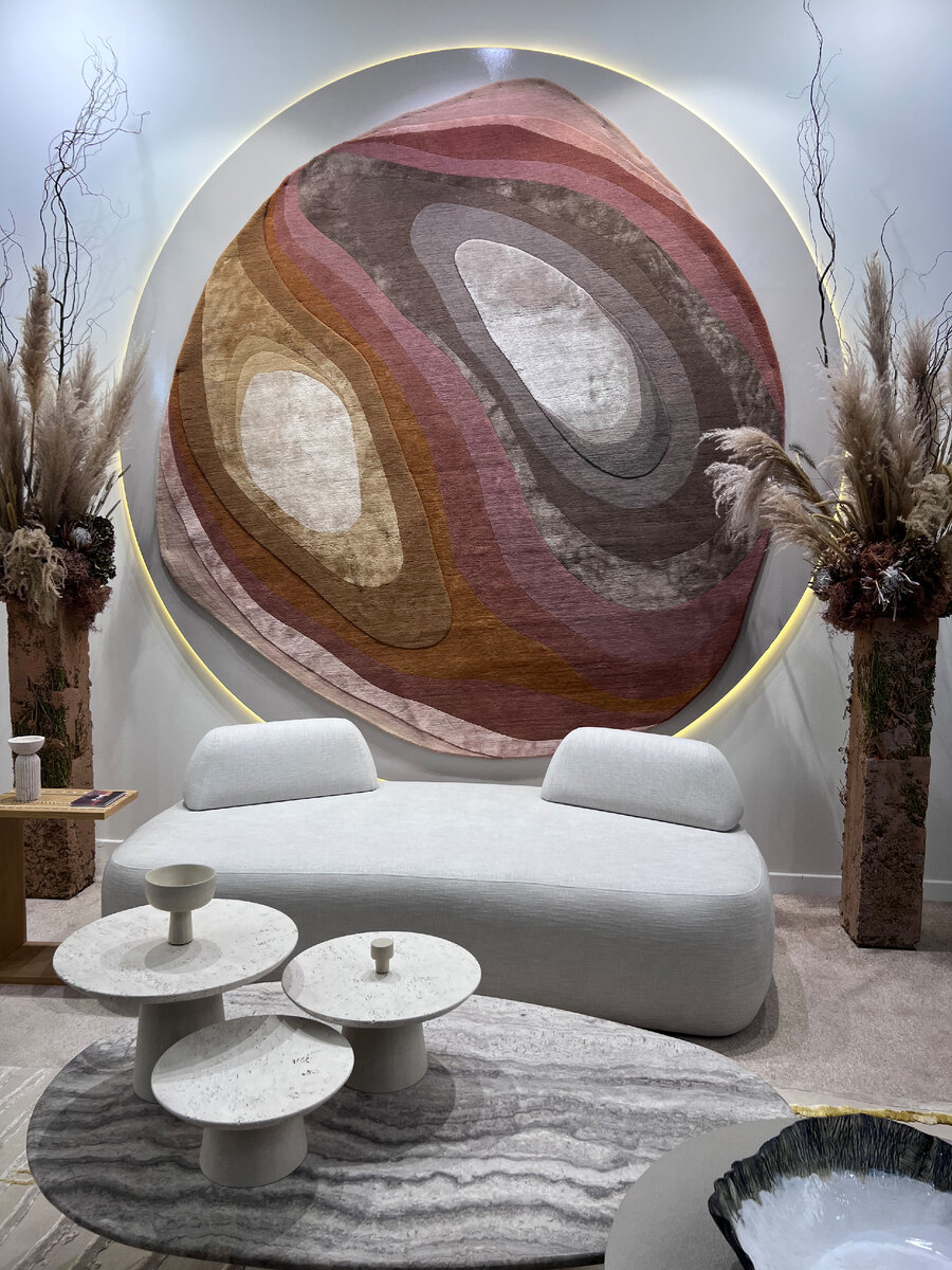 Наше путешествие по выставке начинается с ковров, которые в первую очередь ассоциируются с восточной культурой. Эти изделия были представлены в большом ассортименте: от традиционно правильных геометрических узоров до современных и абстрактных. Присутствующие бренды экспериментировали с яркими чистыми цветами, с темными и монохромными «пятнами», с ворсом разной высоты и плотности, — что позволило создать необычные и запоминающие эффекты, которые способны украсить любой интерьер.