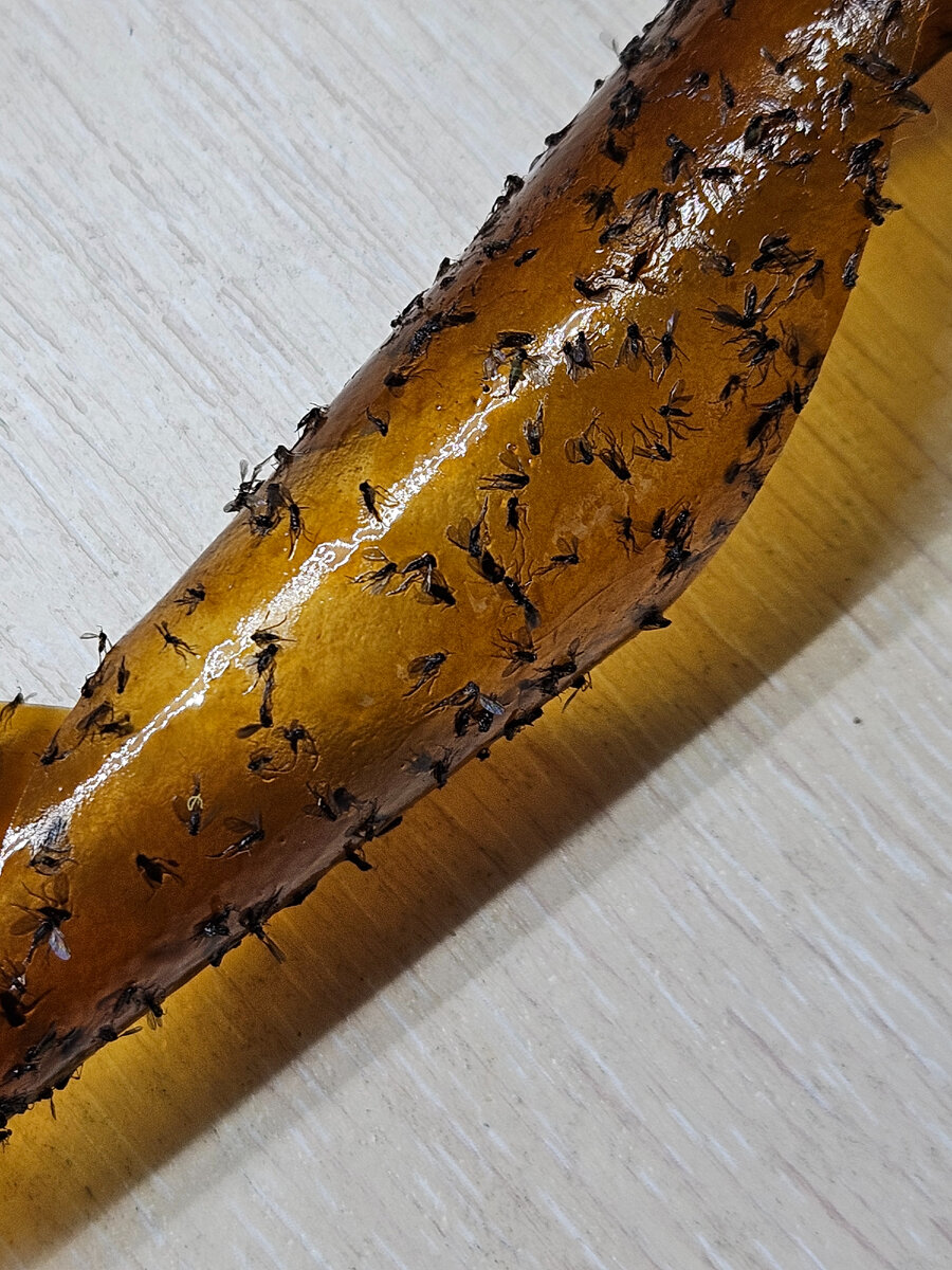 Шок-контента не будет. Будет реалистичность наличия летающих насекомых, приклеившихся к липкой ленте для мух, привезённой с дачи более месяца назад. Многовато особей, нда, слишком многовато. Такой обзор по всей длине ленты, натянутой над ящиком с растениями. Что делать? Может, это последние? Ну, они конечно, ещё полётывают и махают крыльями перед носом, потревоженные переставлениями ящиков с горшками, однако не в таком количестве и не стайным массивом. Вспомним, что покупала? Пока палочки ватные приспосабливала, пока макала два конца в два разных раствора, пока втыкала нужными концами в грунт, обратила внимание, что особей было мало, порхающих в поле видимости зрением. Интересно, почему нет ,,шуршания крыльев"? Вспомнила! Три дня назад, в порыве гнева и опущенного забрала, развела мёда ложку и много капель мяты перечной в 1.5 литрах воды, затем тщательно опрыскала две подоконниковые плантации, да с этажами из стеллажей. Помогло ли? Думаю. Скорее да, чем нет. Сладкая вода попадала на к