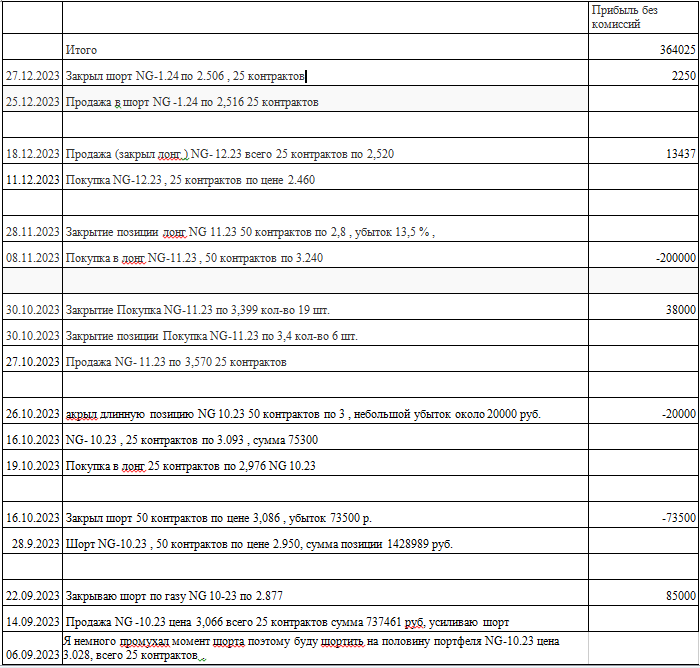 Начало 31.03.2023 -итог 28.12.2023 Торговля планировалась на основе тренда запасов газа США До этого так я ни разу не торговал. Сделал вручную моделирование на основе данных за 5 лет (потребовалось месяц где то ) ожидаемая доходность была около 50 % годовых. Торговля из расчета 1 млн руб своих. Правило было изначально такое что никаких плечей. ТО есть если вдруг брокер поднимет ГО до 40 % , позиция должна выстоять. По итогу немножко влазил в плечи по мере роста дохода- трудно(лень) было высчитывать позу. Итог за 10 месяцев +364 000 грязными, сколько забрал брокер и сколько НДФЛ не знаю , Думаю где то 30 % получается за этот не полный год(10 месяцев). Считаю не плохо. Но могло быть и лучше. Было 2 переезда , смена места жительства, Отвлекало это все конечно. Могу сделать лучше ?? Думаю да. Были ошибки, Больше их постараюсь не допускать. Дисциплина и постоянство ключ к успеху. Газ мне нравиться тем , что можно торговать им постоянно- никуда он не денется. Таблица сделок . Все