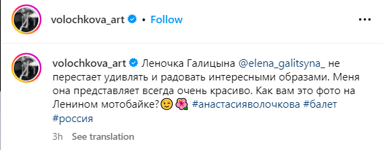 Наша любимая Леночка Галицина реально не перестаёт удивлять и радовать. Кто еще так красиво снимет нашу приму-балерину, как она - лучшая подружка? Правда я уже второй год гадаю, что же вдохновляет Леночку, когда она смотрит на нашу трепетную, нежную и стройную лань? Кого она там видит? Даже не знаю. А так-то да, очень красиво, очень. Хотя я так понимаю, что планировалось что-то раскованное, изящное и женственное. Вот примерное такое: Или такое: Или такое: Но опять что-то пошло не так. Кстати, о мотоцикле. Ради красивой глянцевой фотосессии можно было колёса-то и вымыть. Или хотя бы убрать эту грязь при обработке. Хотя о чём это я, это же любимая подруга. Леночке лучше знать, Леночка художник, она так видит. В общем, спасибо Насте, в очередной раз порадовала прекрасными фото.