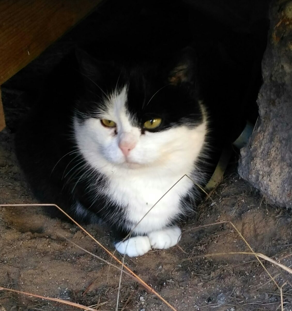 С братом этой осенью произошла неприятность. Он, видимо, засунул голову в какую-то банку, в поисках пищи. А обратно вылезти не смог. Но, помотав головой, банку разбил, а горлышко осталось у него на шее. А зима близко. Стекло холодное и острое. Мы все переживали, но не знали, что делать. Они же все близко не подходят. Несмотря на трехлетнее знакомство, стремглав бросаются прочь при нашем приближении. Хотя издали и выражают взглядами предложение насыпать им еды. Соседи попробовали поймать его большим сачком, чтобы разбить на нём горлышко банки. Но он из-под сачка сумел сбежать. Как же все обрадовались, когда в следующие выходные увидели его уже без стеклянного ошейника. Нашелся, значит, ловкий человек, сумевший освободить кота.