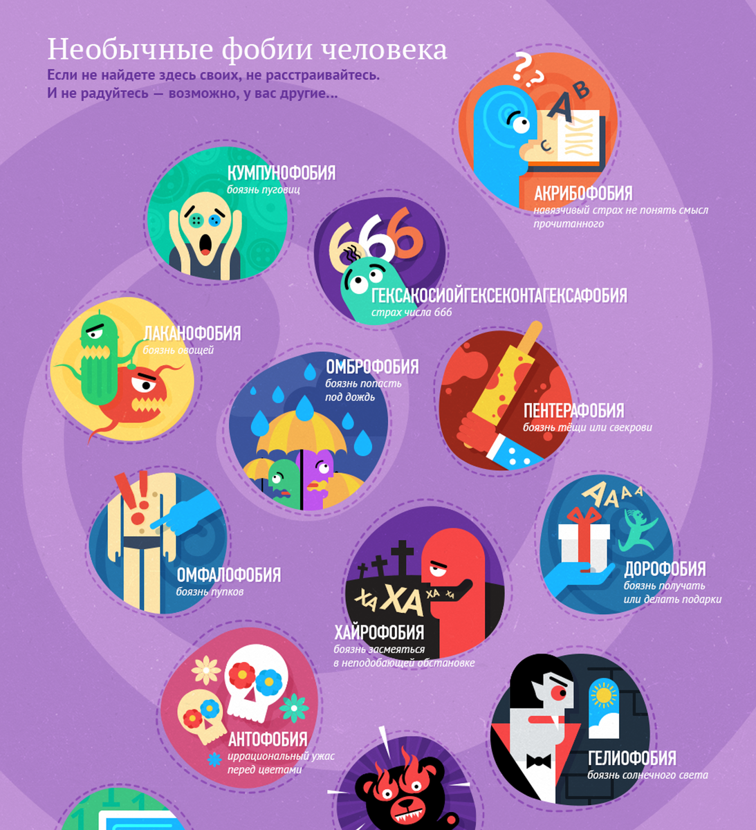 Магейрокофобия: Магейрокофобия - это неразумный страх перед готовкой и может возникнуть из-за травматических ситуаций, связанных с предыдущими кулинарными опытами. Эта фобия может привести к серьезным проблемам, поскольку она может заставить человека потреблять только промышленно приготовленные продукты или готовые блюда (фаст-фуд, вредная пища и т. д.). Страх часто связан с последствиями готовки: страх того, что еда будет непригодной для употребления, что она вызовет болезни и т. д. Кроме того, существуют и другие пищевые фобии, такие как ксоколатофобия (страх перед шоколадом) или ихтиофобия (страх перед пищей на основе рыбы). Омброфобия: Люди, страдающие от омброфобии, не любят осень, потому что у них есть интенсивный страх перед дождем, градом и грозой. Эта фобия близка к бронтофобии, которая является страхом перед сильными метеорологическими явлениями (грозы, молнии, бури, удары молнии). Ануптафобия: Ануптафобия описывает страх перед одиночеством, который может иметь побочный эффе