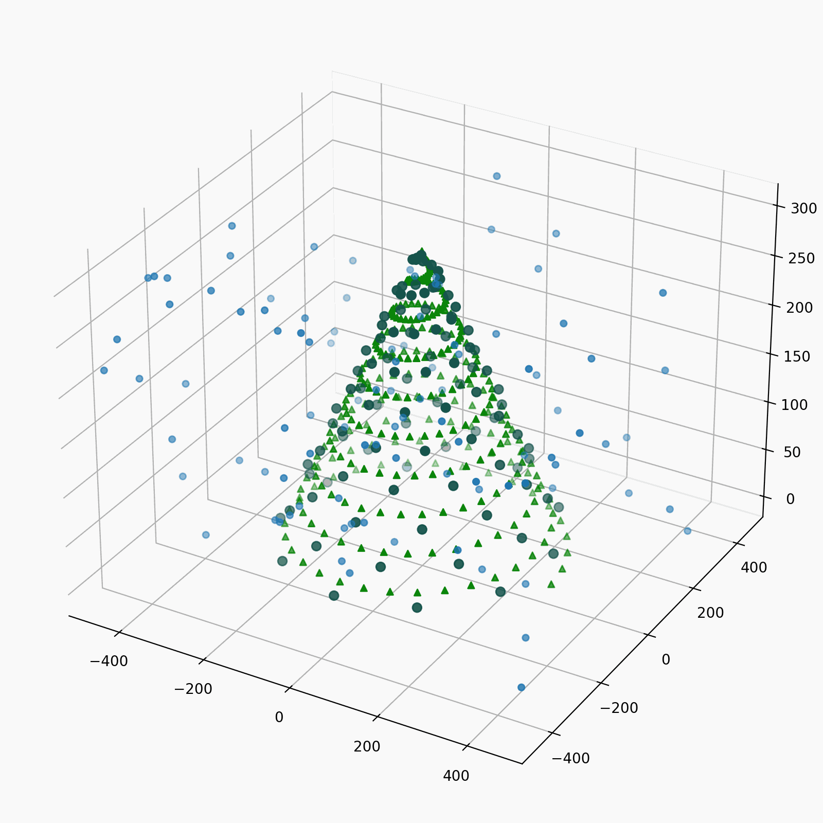 Christmas tree 2024 Ниже приведу просто листинг программы: import random import math import matplotlib.pyplot as plt from matplotlib import animation import numpy as np plt.style.use('_mpl-gallery') # Make data np.random.seed(19680801) n = 100 rng = np.random.default_rng() xs = rng.uniform(-500, 500, n) ys = rng.uniform(-500, 500, n) zs = rng.uniform(0, 300, n) fig=plt.figure(figsize=(8,8)) # создаем фигуру 'fig' размером 8х8 дюймов number_of_colors=8 colors=["#"+''.join([random.choice('0123456789ABCDEF') for j in range(6)]) for i in range(number_of_colors)] def animate(f): fig.clear() ax=fig.add_subplot(111, projection='3d') k=300 X=[math.cos(i/5+f/10)*(k-i) for i in range(k)] Y=[math.sin(i/5+f/10)*(k-i) for i in range(k)] Z=[i for i in range(k)] ax.scatter(X,Y,Z, c='green', marker="^") step=3 Z=[i for i in range(1,k,step)] X=[math.cos(i/5+ 2 + f/10)*(k-i+10) for i in range(1,k,step)] Y=[math.sin(i/5+ 2 + f/10)*(k-i+10) for i in range(1,k,step)] ax