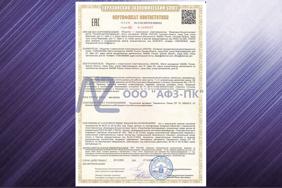 Компания «АФЗ-ПК» получила сертификат соответствия ТР ТС 032/2013 на промышленную трубопроводную арматуру. Документ распространяется на задвижки стальные клиновые штампосварные и литые.