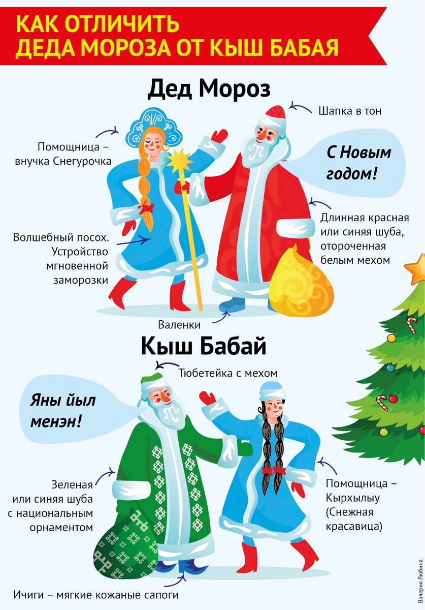 В Башкирии проживают представители 160 национальностей. И в каждой семье из поколения в поколение передаются народные традиции, обычаи, в том числе связанные с празднованием Нового года. Поэтому в новогоднюю ночь в наши семьи с подарками приходит не только Дед Мороз, но и его многочисленные коллеги. Узнаем, как их зовут. 1. РУССКИЙ ДЕД МОРОЗ Самый популярный в России зимний волшебник. Изначально его называли на Руси Мороком – духом холода, и был это отнюдь не добрый персонаж. Ходил он растрепанный, косматый, в рубахе и лаптях. Подобрел Дед Мороз только в XIX веке, когда его прообразом стал Николай Угодник, один из самых почитаемых святых – милосердный, приносящий подарки детям. 2. БАШКИРСКИЙ КЫШ БАБАЙ Издревле, как и все тюркские народы, Новый год башкиры отмечали весной, в день весеннего равноденствия. Но Кыш Бабай, что в переводе – Зимний Дедушка, существовал и тогда. Это дух зимы, который управляет морозами, снегопадами и студеными ветрами. Как и русский Дед Мороз, Кыш Бабай им