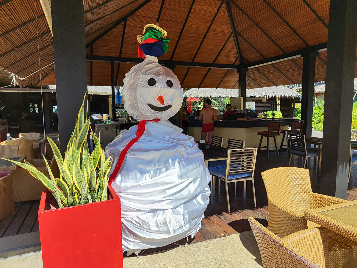 На Чанге елки не растут от слова совсем. И не завозят их живые сюда перед Новым годом. Некоторые солидные отели и магазины устанавливают искусственные елки, украшают примерно так, как принято у нас, сажают под нее кого найдут. А те отели, что попроще, сооружают елку и украшения из подручных средств. Некоторые чисто формально, чтобы обозначить праздник. А некоторые подошли очень даже креативно, проявив и выдумку, и юмор. За несколько дней до праздника мы проехались по пляжам и отелям острова Чанг и я сфотографировала "елки". Предлагаю всем вместе выбрать самые креативные. Или вам больше по душе традиционные? Елки будут пронумерованы. Жду в комментариях номер понравившегося новогоднего символа. 1. Отель "Centara Koh Chang Tropicana Resort" В этом отеле с большой, похожей на парк территорией, сразу несколько елок и все... не елки. Да и снеговик не снеговик. Стоит он прямо у бассейна. Как только не растаял? Одну елку мы нашли рядом с детской площадкой. Украсили ее ракушками и скорлупой