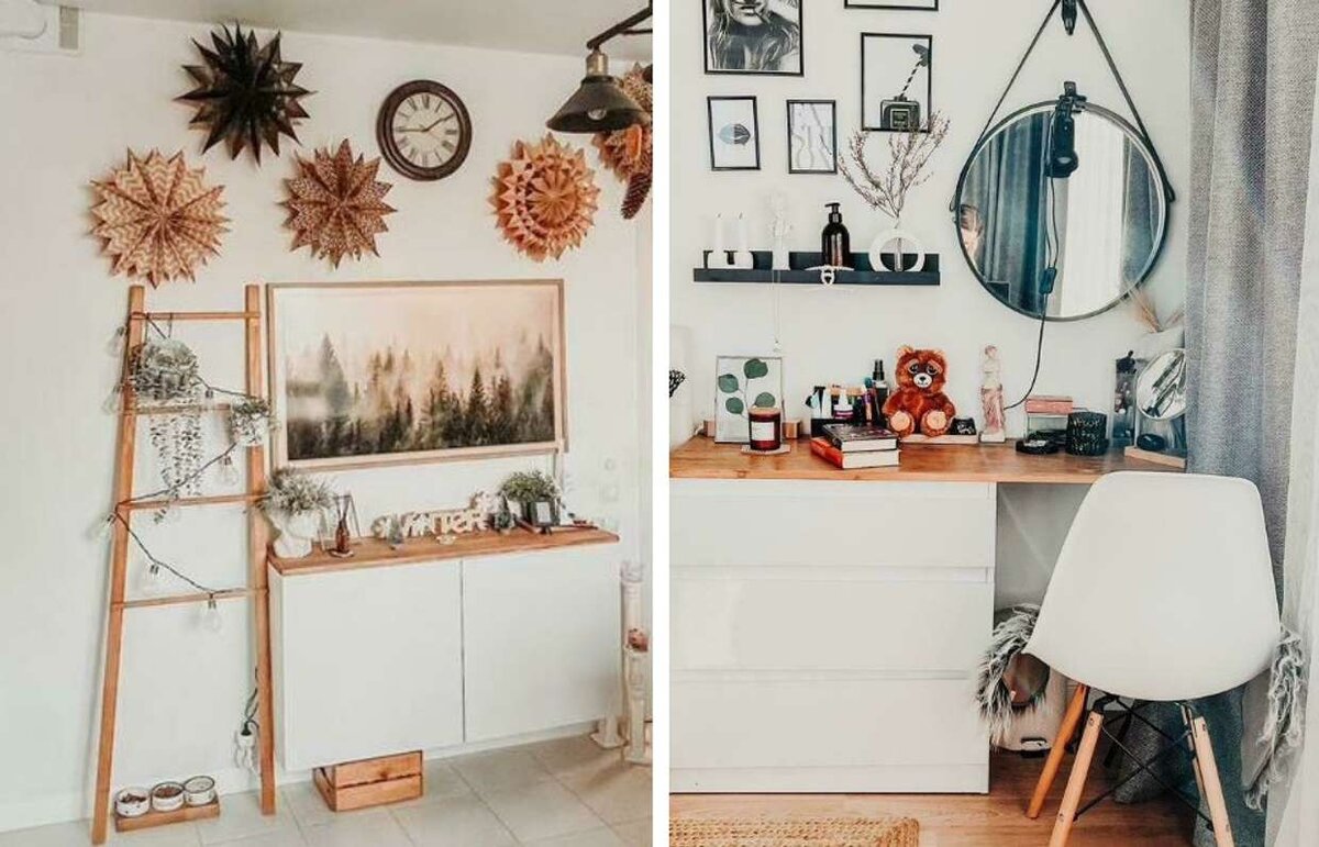 Еще одна оригинальная идея — превратить старый комод в туалетный столик. Для этого наша героиня использовала столешницу: ее положили на комод и закрепили на кронштейн с другой стороны. Выдвижные ящики служат для хранения вещей, косметику и другие предметы также можно разместить на поверхности.