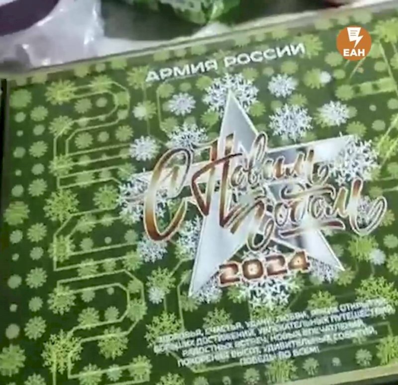 «Кофе, шпроты, сгущенное молоко, печень трески, ветчина, чай, колбаса, естественно, американский Snickers, еще одна колбаса, сыр, коньяка нет», - пошутил боец, и поздравил всех с наступающим Новым годом.