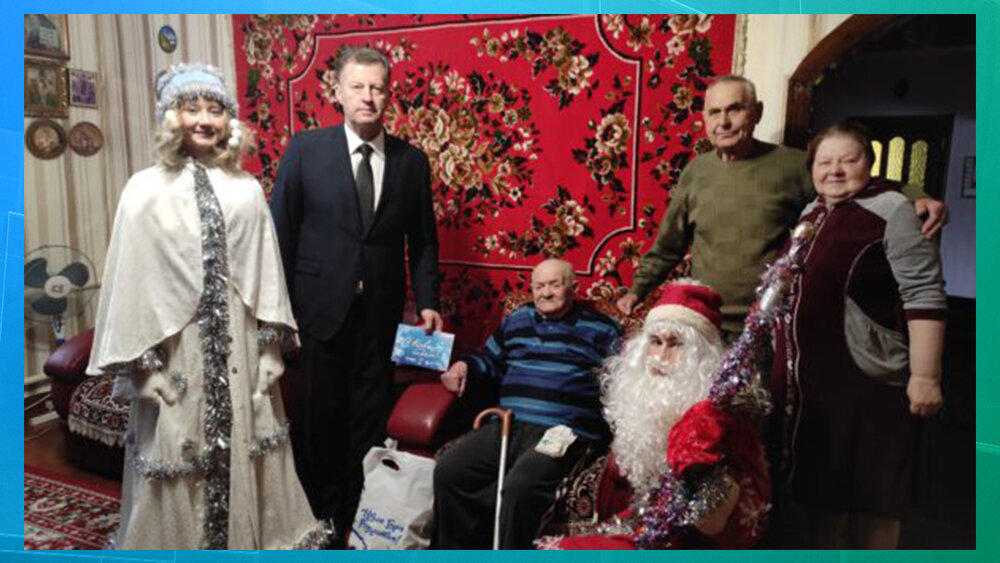Ветеранам вручили поздравительные открытки от «Единой России» и от губернатора Александра Богомаза. После этого Дед Мороз и Снегурочка вручили сладости и продукты, которые станут приятным дополнением к их праздничному столу.
