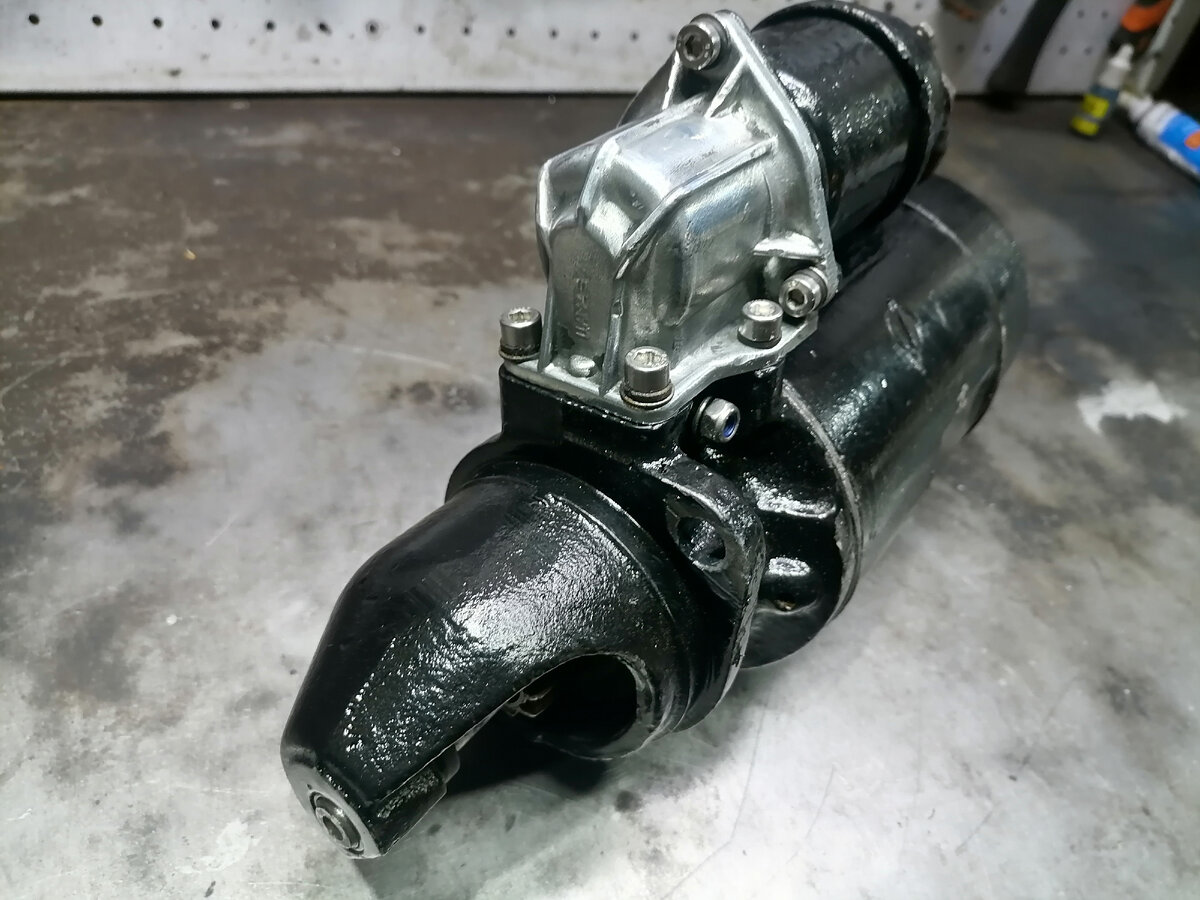 Все таки не удалось уговорить себя собирать двигатель "как есть", отвез коленвал в ремонт (на шлифовку коренных шеек), да и гильзы заодно на промер. А пока займусь мелочами, без которых никуда. Первый в очереди - стартер, вопросов к нему не было - машина не только прерасно заводилась, но и неплохо ездила на стартере (по гаражу, когда мотор был уже частично разобран). Что не удивительно, при таких впечатляющих размерах - к примеру, на моем дизельном Т4 стартер в два раза меньше, а там компрессия, на минуточку, втрое большая. Тем не менее, обслужить все равно надо - чтобы не было сюрпризов. Шаг первый - деталь на стол, осматриваю - внешне все в порядке. Шаг второй - в тиски его, да разобрать до винтика. Внутри следы времени, за 44 года я у него, похоже, первый. Шаг третий - корщетки в зубы - и начищать все это до блеска котовьих шаров. Шаг четвертый - все, что не из алюминия - крашу, алюминий - шлифую-полирую. Ну и четвертым шагом надо все это дело собрать. Кровь немного попоротила м