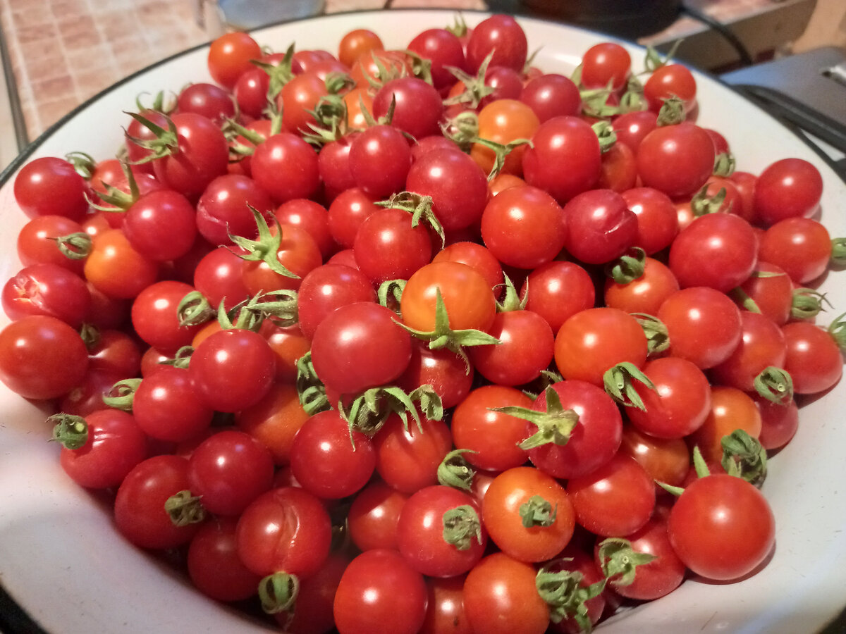 Урожай пришлось собирать ведрами и тазами. Понаклоняйся к каждой ягодке, собери. А собирать надо так: оторвать умудриться вместе с плодоножкой, иначе томатик сразу разомнется, и до дачи не донесешь. То есть надо каждую помидорку, придержав за веточку, оторвать ногтями от веточки этой.