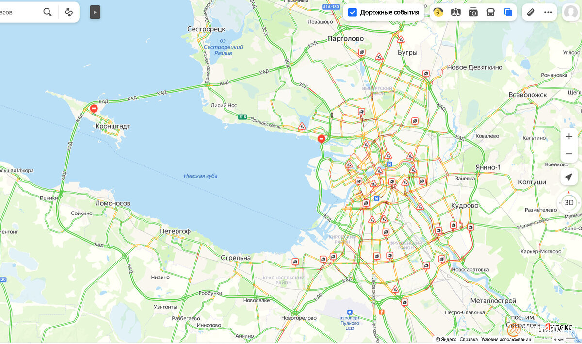 По данным «Яндекс.Пробок», на внутреннем кольце КАД скопилась самая длинная пробка для этого времени суток за последнюю неделю. Затор растянулся на 10,3 километра — от реки Оккервиль до виадука над железной дорогой. Одновременно в 4-километровой пробке встали Мурманское шоссе и Народная улица в сторону города. Затор тянется от КАД до Володарского моста. Плотно стоят также Октябрьская набережная, Дальневосточный проспект и проспект Большевиков к Народной.