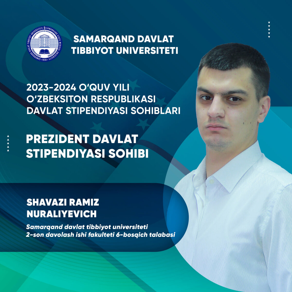 Студенты отличившиеся образцовыми знаниями и амбициями, талантом и потенциалом, отличными оценками в вузе, где они учатся, стали обладателями именных государственных стипендий. Лауреатами государственных стипендий Республики Узбекистан стали и следующие студенты Самаркандского государственного медицинского университета! Пресс-служба СамГМУ