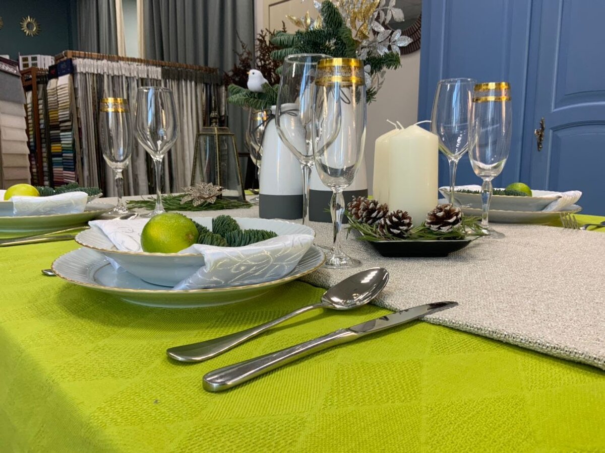 Он нарядный с люрексовыми нитями и хорошо вписывается в цветовую палитру сервировки.