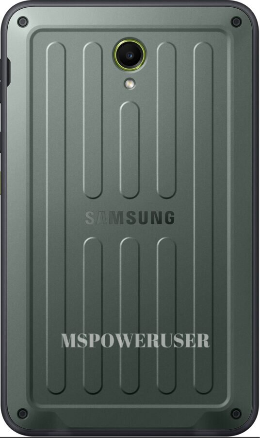 В Сеть попали рендеры защищённого планшета Samsung Galaxy Tab Active5. На модель Galaxy Tab Active4 Pro новинка похожа лишь отчасти. Главное отличие — ориентация. Если у Active4 Pro физические кнопки расположены под экраном при горизонтальном размещении планшета, то у новинки — при вертикальном. Сообщается, что новинка получит восьмидюймовый экран с разрешением 1920 × 1200 пикселей, восьмиядерный процессор (ранние данные указывают на Exynos 1380), аккумулятор ёмкостью 5050 мА·ч, 13-мегапиксельную камеру, 4/64 либо 6/128 ГБ памяти, Wi-Fi 6, Bluetooth 5.3. Само собой, будет защита от воды, пыли и физических воздействий: IP68 и MIL-STD-810H. Габариты новинки составят 126,8 × 213,8 × 10,1 мм при массе 433 г.