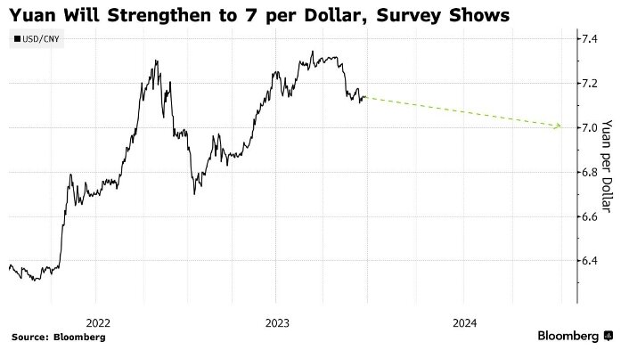Китайский юань укрепится впервые за три года в 2024 году, поскольку сокращение разницы в процентных ставках притормозит отток капитала, показывает опрос Bloomberg.