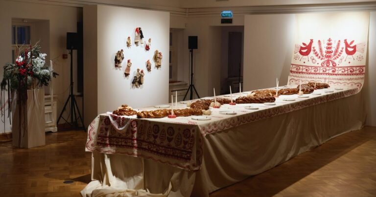 Свадебным традициям на выставке уделили не меньше внимания, чем нарядам. В одном из залов музея стоит стол, накрытый огромной скатертью-рушником. На ней — праздничная сервировка и угощения. А поблизости — украшенные лентами еловые ветки. И это не новогодний декор. Накануне свадьбы подруги невесты собирались на девичник. На нем они плели венок, а еще делали бумажные цветы, которыми украшали свадебное дерево — молодую елочку. Наряженное деревце оставалось в доме невесты до приезда за ней жениха.