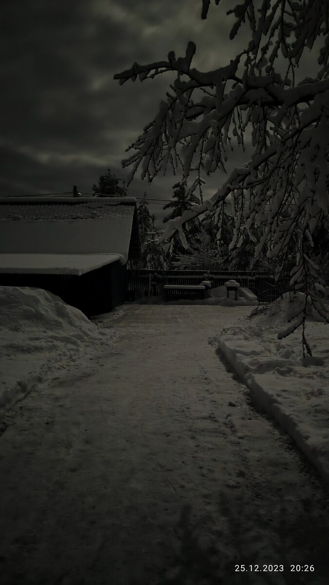 Возвращаясь к понедельнику, хочется отметить, что электрические колебания предсказуемо закончились полным отключением. Свет пропал. Наступила тьма. Относительная. Луна светила, снег отражал и на улице было гораздо светлей, чем в доме. Мы пошли гулять. Мой друг Баксик был ошарашен тем фактом, что если б Мать не позвонила и не попросила б задержаться, то Баксик вышел бы без ключей от калитки и не смог бы попасть домой. Ворота у него электрозависимые. Я про себя поставил плюсик в графу "Достоинства" моего тайного списка "Жить по-старинке". (рабочее название "В трущобах"). Я скрываю его от Ферапонта, а то он и на эту тему подкаст запишет. Так вот. Только Бакс собрался выходить, как отрубился свет. Они откопали калитку и взяли ключи. Теперь он сможет вернуться домой, хотя я и предложил ночевать у меня в экстренном случае. Гуляем. Фонари не горят, привычное выглядит странно. У трансформатора миниМать заметила далёкий огонёк в лесу. Чу... Голоса? Нет, это не Двенадцать месяцев. Это электром