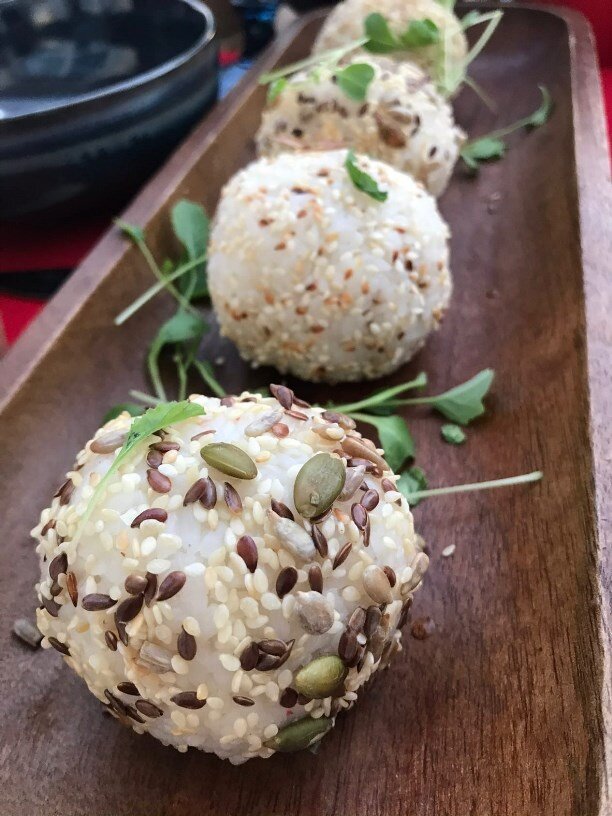 - После того, как рис остыл на столько, что вы можете взять его в руки нужно сделать блинчик из риса в него положить внутрь ложку начинки и слепить шарик , совместив все края наверху. Чтобы рис не прилипал к рукам, можно смазать их кунжутным маслом или любым другим растительным. Шарик обсыпать немного кунжутом и все.