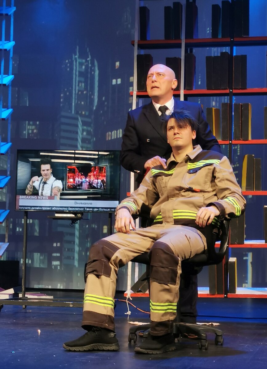 Антиутопия Брэдбери об обществе, в котором люди не читают книг, а лишь потребляют телевизионный и медиаконтент, когда-то казалась фантастикой. Фантастикой осталась пожалуй только радикальная борьба с печатной продукцией — сжиганием книг, а вот все остальное в спектакле, поставленном режиссером Андреем Любимовым с труппой Владимирского Академического областного театра драмы, калька наших дней. Постоянная реклама впитывающих прокладок и подобной продукции, перебивающая абсурдные в своей тематике реалити-шоу. Сменяющая этот красочный рекламный мир информация о приближающейся войне и призывах не тревожиться по этому поводу, поскольку обороноспособность страны на высоте, что демонстрируется с ревом пролетающими бомбардировщиками. Сумасшедший мир, население которого привыкло жить в подобной обстановке. Никому не кажется странным, что пожарные занимаются не тушением пожаров, а созданием костров из книг. Вот только это последнее для зрителей выглядит вымыслом, а остальное...