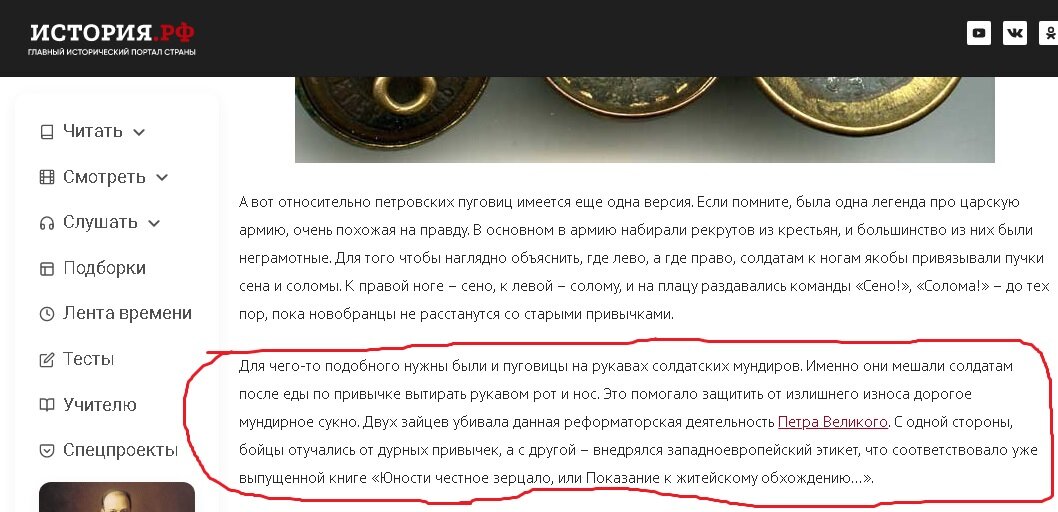 На просторах интернета с упорством, достойным лучшего применения, продолжает тиражироваться история о том, как некий монарх приказал пришить на рукава военных мундиров пуговицы, чтобы отучить солдат своей армии этими самыми рукавами вытирать нос (или в другом варианте – рот после еды). Наличие пуговиц, по мысли рассказывающих эту историю, должно было мешать солдатам использовать рукава своих кафтанов указанным образом. Чаще всего честь данного инновационного изобретения приписывается Петру I. Именно такую разновидность этого сюжета рассказывает, например, «главный исторический портал страны» История.рф