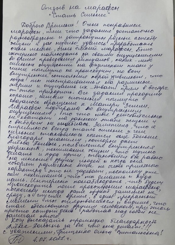 Мощнейшие марафоны Ведьмы Алены Полынь помогают людям менять свои жизни, о чем свидетельствуют многочисленные отзывы присланные нам. Вашему внимаю представляем отзыв о Марафоне «Стать Сильнее», в котором автор делится своей историей, как Марафон ей помог. Доброго Времени! Очень понравился Марафон, тем что задания достаточно разнообразные и затронуты разные аспекты жизни и за неделю удалось проработать очень многое, очень ёмкий марафон. Было интересно наблюдать за своими ощущениями во время проведения ритуалов, каких-либо сильных ощущений на физическом плане у меня почему-то не происходит, но вот внутреннее состояния порой удивляют, что когда ты сонастраиваешься на различные энергии и ощущаешь их … бывает прям в восторг от этого приходишь. Все задания проходили хорошо, самым сложным почему-то оказалось обращение к Матери Земли.