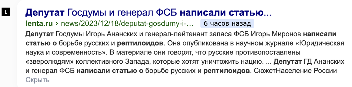 В этой истории меня прежде всего потрясло то, что упомянутая статья опубликована в научном журнале «Юридическая наука: история и современности». На сайте издания указано, что журнал имеет аккредитацию в Российском индексе научного цитирования(РИНЦ). Это что же получается, теперь любой комментатор в сети сможет связать свои утверждения о рептилоидах и "зверолюдях" с научной литературой?