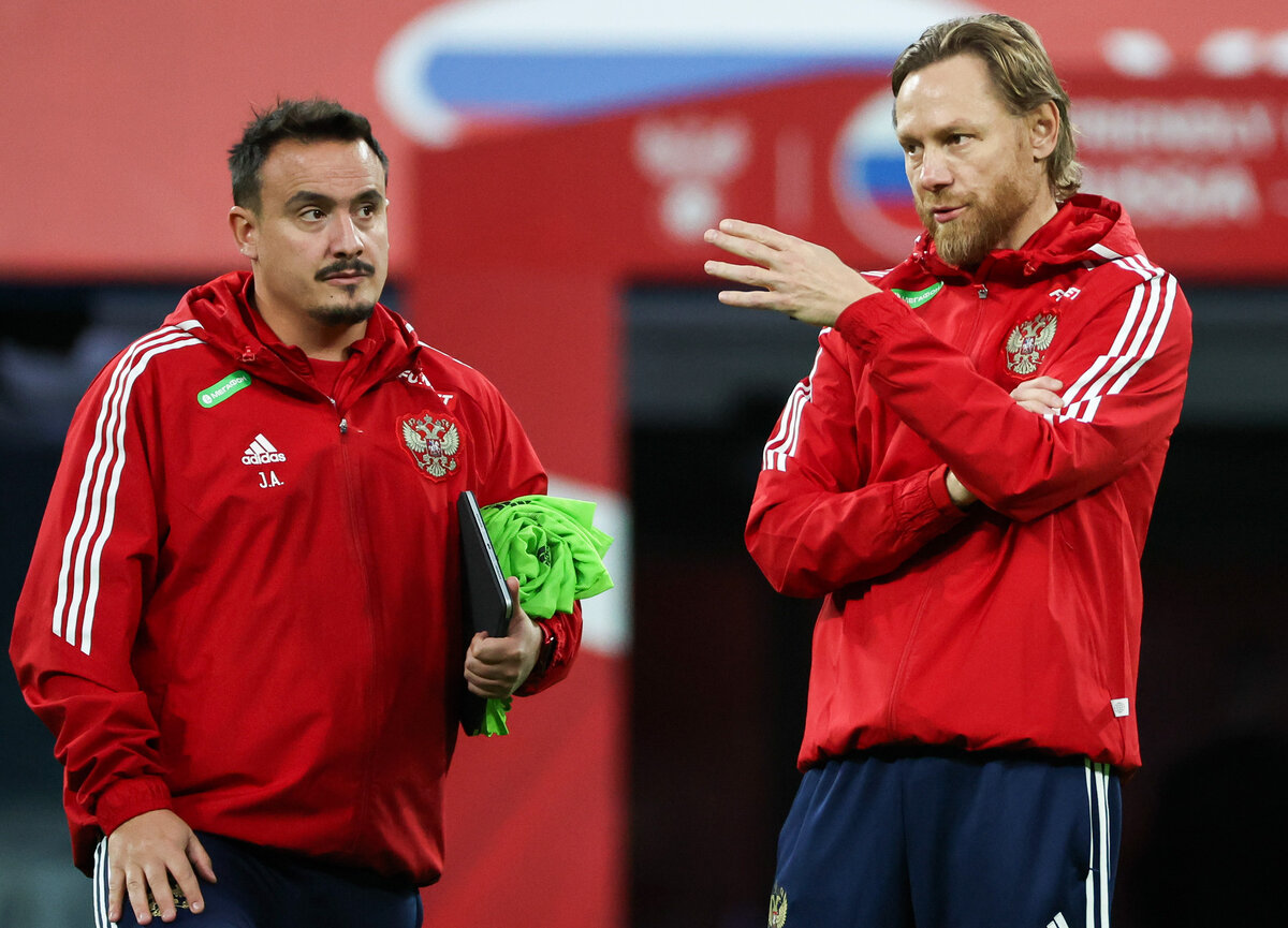 автор Светлана Ломакина/заглавноефото Петра Ковалева (ТАСС): главный тренер и тренер-аналитик сборной России по футболу Валерий Карпин и Джонатан Альба