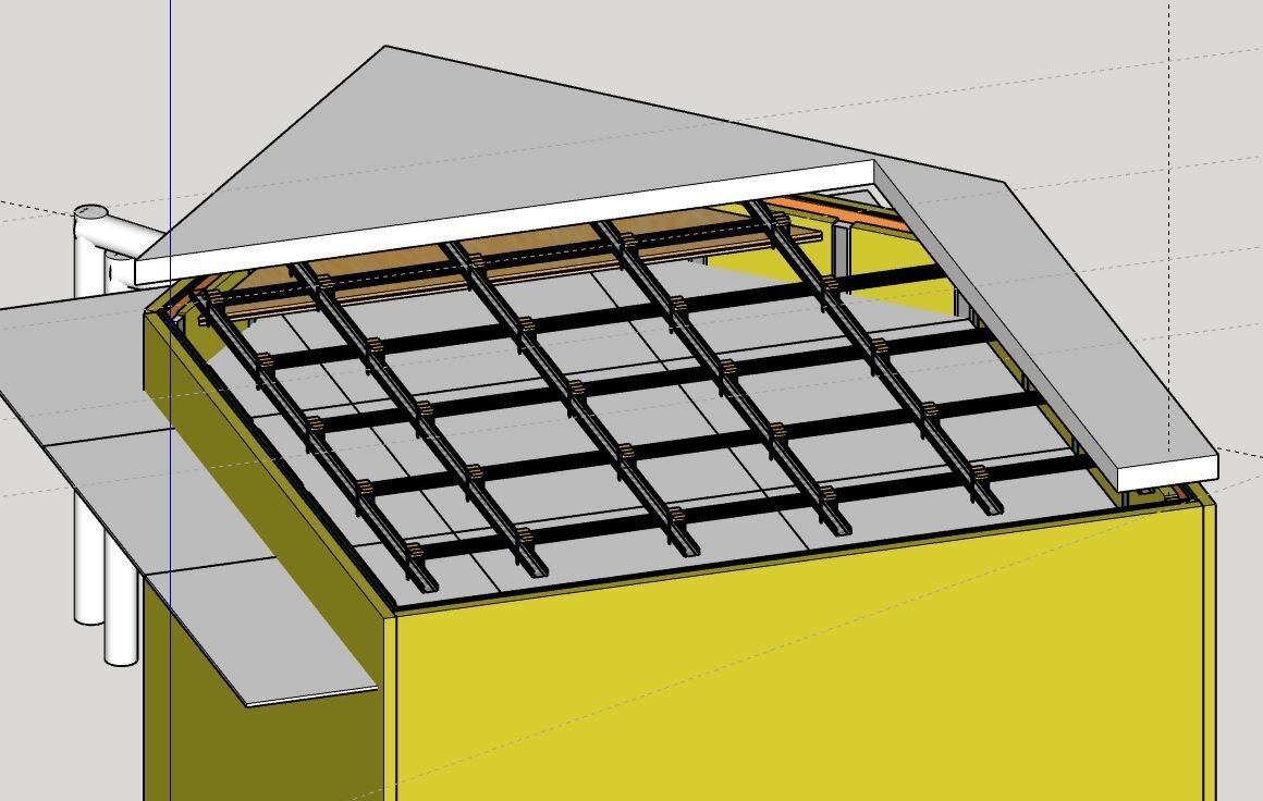 Перехожу к потолка монтажу :-) Потолок будет подвешен на швеллерах — их прочности должно быть достаточно, чтобы выдержать массу подвесного потолка без прогиба. Я остановился на горячекатанном швеллере 65х36. 6-метровые швеллера в магазине мне распилили на нужные размеры, которые я посчитал в Скетчапе и перепроверил рулеткой по месту. Далее изготавливаю опоры для швеллеров, через которые потолок будет опираться на стены. Делаю из той же МБС. Места прилегания швеллера к МБС прокладываю кусочками гидроизола, предварительно их разогрев феном, чтобы не происходило перемещения и сдвигов во время монтажа. Потом, к этим "несущим" швеллерам я монтирую профиль для монтажа подвесного потолка (профиль потолочный Knauf 60x27). Очень важно производить монтаж профилей с использованием уровня. Очень давно купил себе Bosh PCL10 и он меня много раз выручал. Жаль, нельзя в нем зафиксировать положение лазера во включенном состо