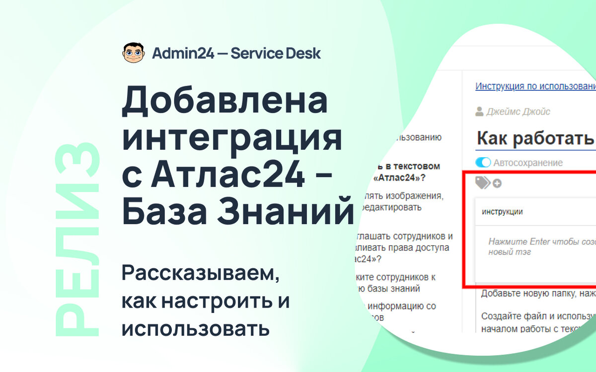 Атлас 24 – База Знаний – это платформа для хранения и систематизации документов. Рассказываем, как использовать ее возможности в Admin24 – Service Desk. 7 декабря вышел новый релиз Admin24 – Service Desk, в котором мы добавили интеграцию с сервисом для создания баз знаний Атлас24. Атлас 24 – База Знаний – это платформа для хранения и систематизации документов: руководств, инструкций, шаблонов, скриптов для общения с клиентами. Она позволяет иметь доступ к нужной информации из любой точки мира, работать над документами совместно с сотрудниками и создавать тесты для проверки знаний. Обо всех возможностях сервиса мы рассказывали здесь. Как настроить интеграцию с Атлас24 Чтобы начать работу с документами в Admin24 – Service Desk, в личном кабинете на боковой панели выберите раздел «База знаний». Последующие действия будут зависеть от того, использовали ли вы ранее Атлас24 для хранения информации. Сразу предупреждаем: после привязки базы знаний к организации отменить это действие самостояте