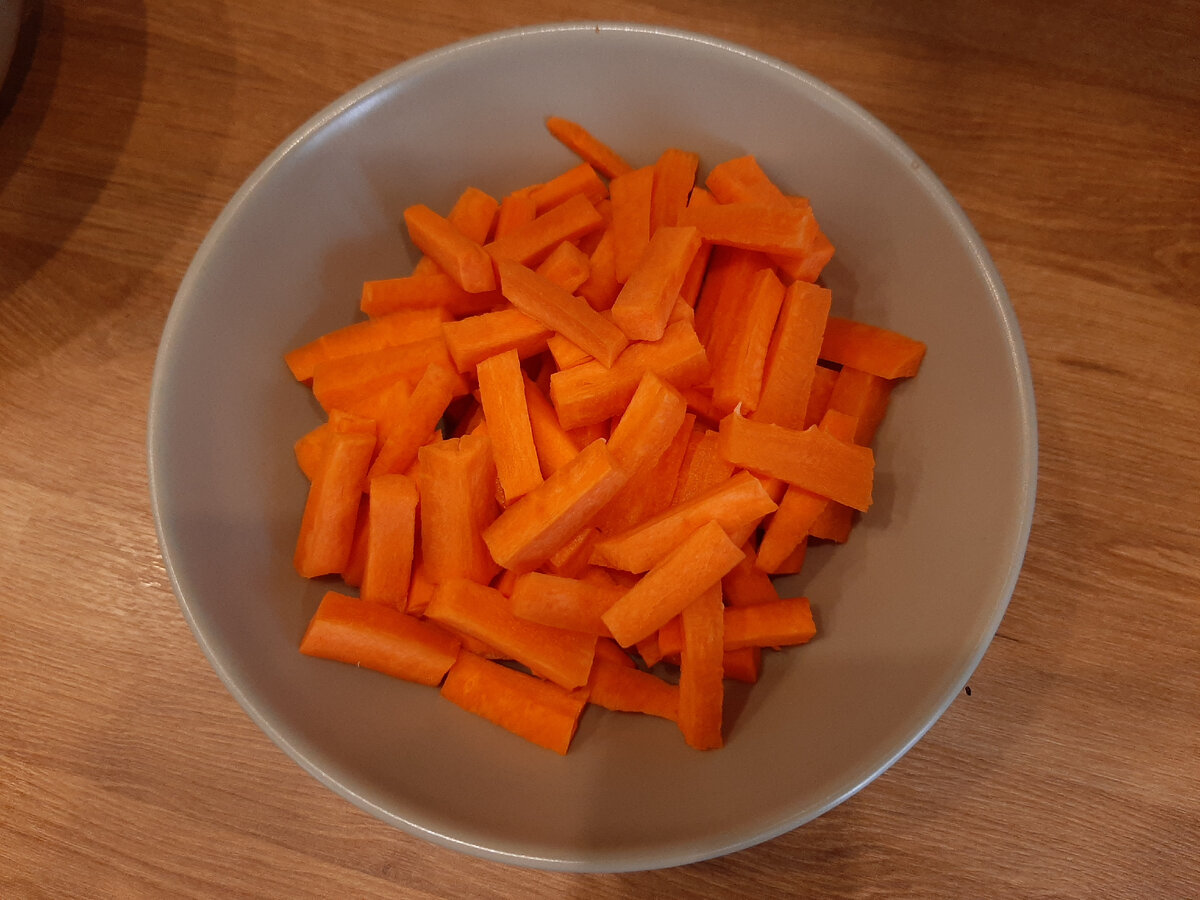 Для плова нам понадобится: 1) Рис жасмин или басмати примерно 400гр 2) лук 1шт крупная 3) чеснок 3 зубчика 4) морковь 1шт крупная 5) филе бедра 300 гр 6) лавровый лист(3шт), зира- 1ч.л, куркума- 1ч.л, соль- 1 ст.л, Барбарис по вкусу. 7) подсолнечное масло на дно сковороды. 8) вода- 200мл.(горячая) Плов я всегда готовлю в сковороде с высокими полями( обязательно с крышкой), диаметром 28см, так получается быстрее и вкуснее, а само приготовление занимает 15-20мин. Для начала нальём масло на дно сковороды. Нарежем лук на четверть кольцами и чеснок мелко, добавим в сковороду, обжарим до золотистости. Далее нарежем морковь. Я режу брусочками, вкус раскрывается по- другому. Добавляем морковь к луку с чесноком, жарим на маленьком огне, пока морковь не станет золотистой. После добавляем 1ст.л соли без горки, чайную ложку зиры, чайную ложку куркумы, барбарис по желанию, лавровый лист 3 шт, все перемешать, по желанию можно добавить целую головку чеснока для аромата. Далее нарезаем ф