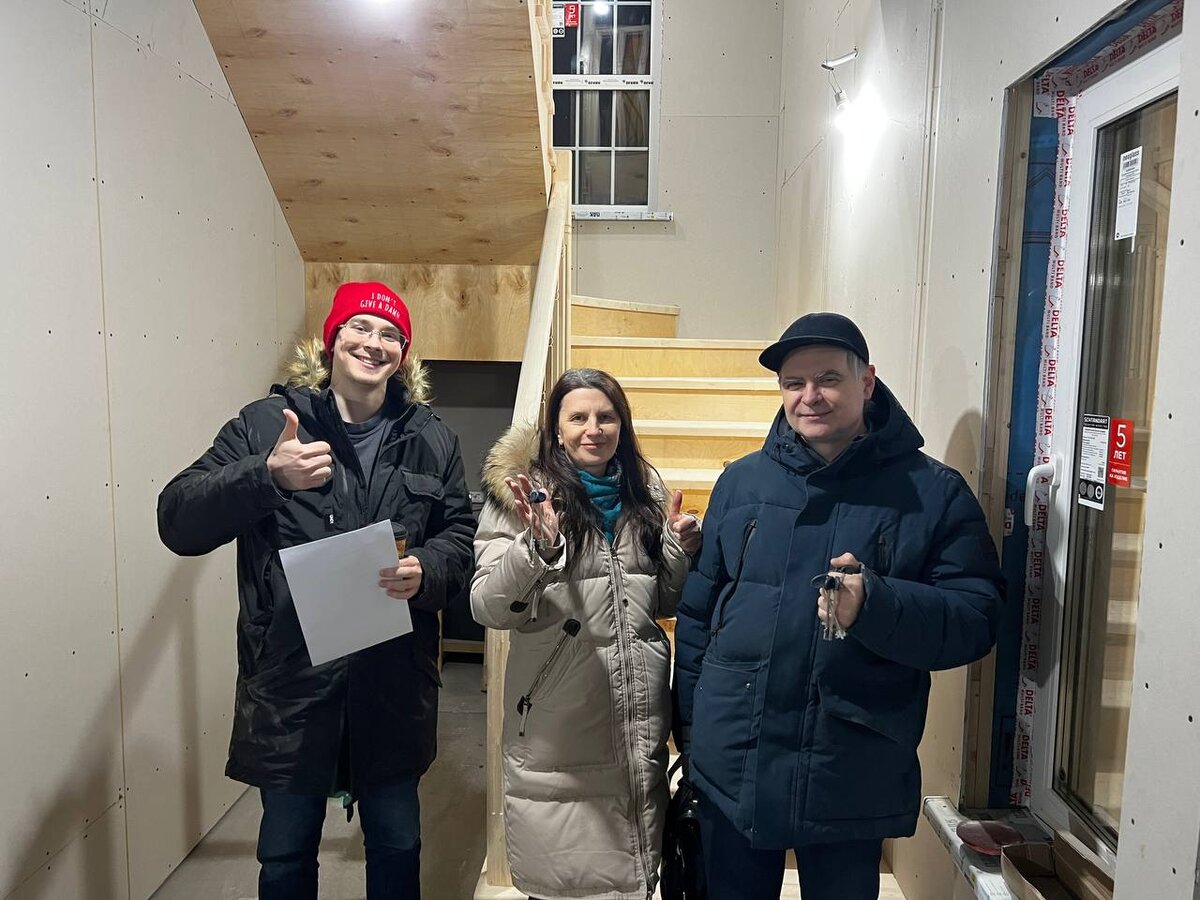 Счастливыми обладателями большого каркасного дома стала прекрасная семья из трех человек! Работали мы по индивидуальному заказу, поэтому получилось реализовать все задумки и пожелания с высокой точностью! А сколько ярких эмоций было при передаче ключей — стало понятно, что новые владельцы с домом подружатся.