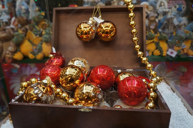 Полюбовалась елочками, пофотографировала их. Про елочки будет обязательно, а пока про игрушки. Вокруг фонтана-елки развернулась бойкая торговля новогодними украшениями и атрибутами праздника.