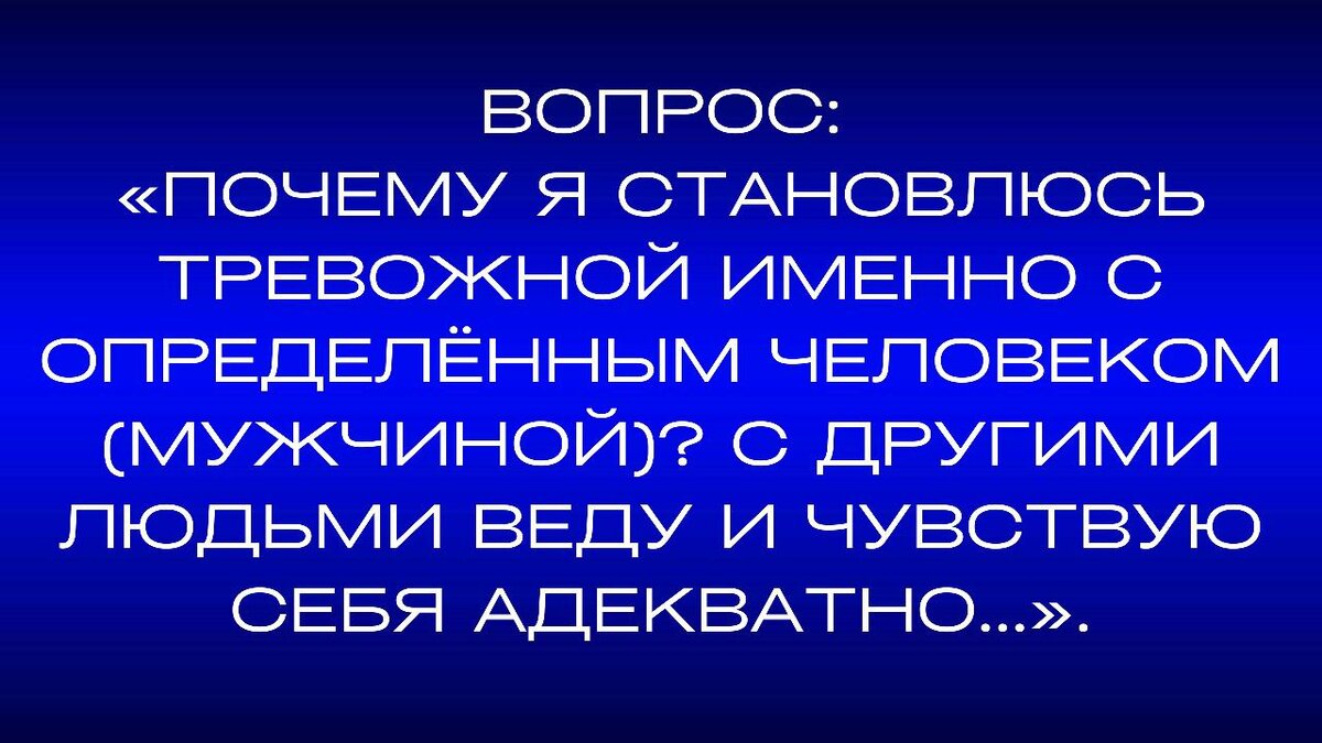 Вопрос: «Почему я становлюсь тревожной именно с определенным человеком (мужчиной)? С любыми другими людьми веду себя адекватно и чувствую себя тоже отлично...». Когда человек становится тревожным с другим? Когда другой и отношения с ним являются значимыми. Когда хочется выстроить с ним близкие отношения, а не получается. Или когда есть нерешенные проблемы, которые люди не обговаривают и замалчивают. Когда по отношению к этому человеку есть серьезные или завышенные ожидания. Когда хотите управлять им или сделать себе удобным. Когда ждете от человека определенных действий, а он их и не собирается совершать. Так как ему эти отношения не нужны. Когда общаетесь из позиции «над» другим, и он пытается восстановить иерархию, возвращая вас в равную позицию. Когда надеваете маску, хотите казаться лучше и пытаетесь скрыть свои недостатки, притворяясь не тем, кем являетесь. Когда нет знаний, что делать в той или иной ситуации и как общаться именно с таким типом личности. Когда общаетесь из детско