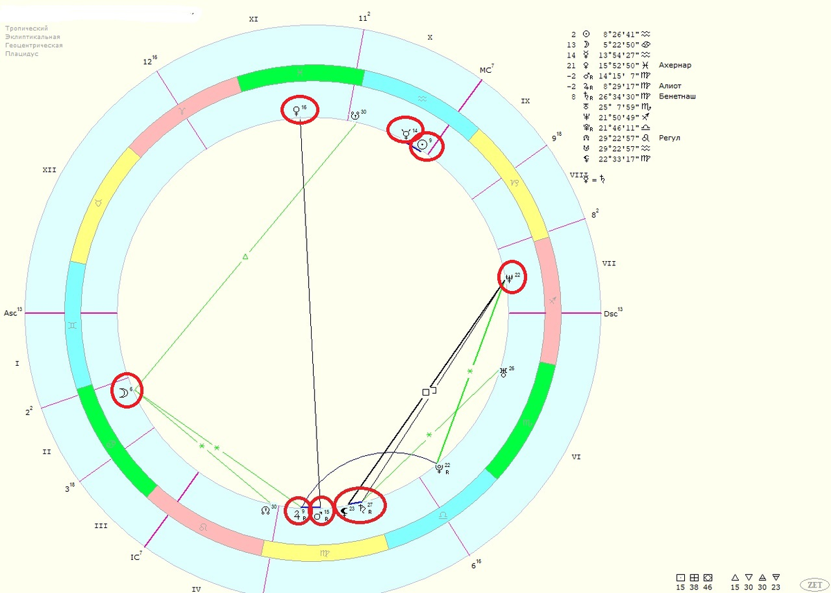 Красными кружками я отметил все планеты - акцепторы любви и отношений, которые могут быть на протяжении жизни спровоцированы различными промиссорами на определенные действия. В частности, выделяется стеллиум из 3 –х напряженных планет (Юпитер Марс, Сатурн) в знаке Девы в 5-ом доме гороскопа.