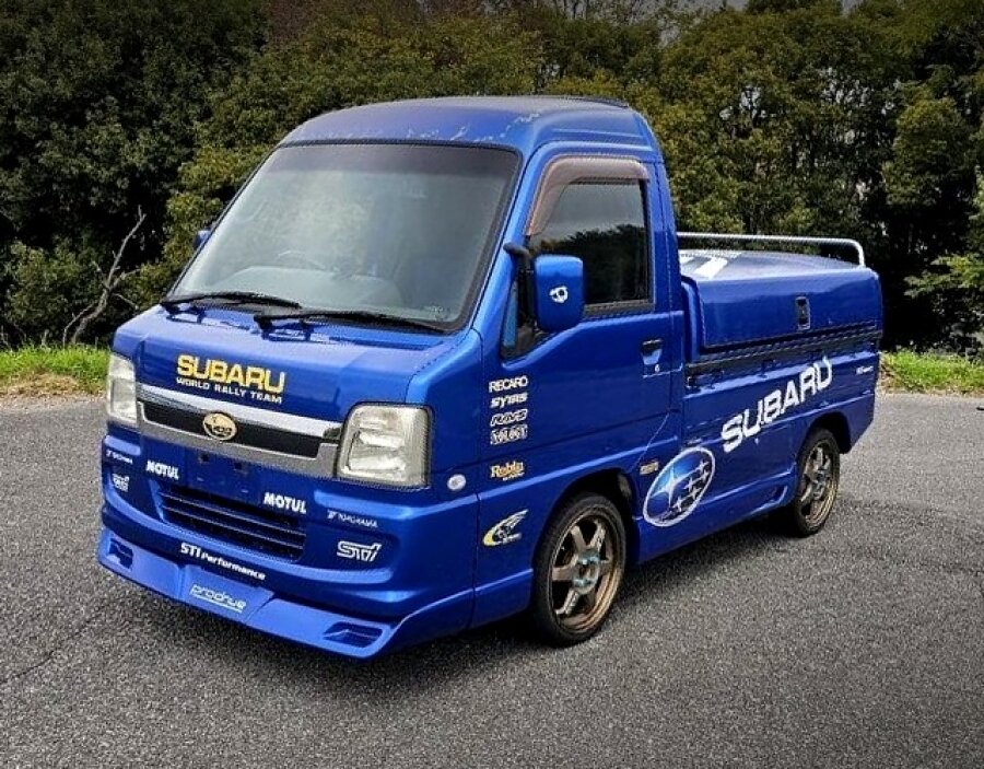 Это мог бы быть самый милый раллийный Subaru, но этому, конечно же, не суждено было сбыться. И всё же лавры тех самых ярко-синих Subaru с золотистыми наклейками, которые участвовали в WRC, не дают покоя владельцам самых разных моделей бренда, поэтому на свет появляются подобные проекты. Перед нами крошечный грузовичок кей-класса Subaru Sambar 2007 года выпуска, который получил спортивный обвес и ливрею, выполненную в стилистике окраски оригинальных раллийных Subaru Imreza. Во внешнем виде внимание привлекает особый обвес, кожух над кузовом и 15-дюймовые золотистые колёсные диски VOLK. Внутри можно найти 2 ковшеобразных сиденья Recaro с синими вставками и сочетающееся по стилю рулевое колесо. Двигатель EN07 остался стандартным. В данном конкретном случае он имеет рабочий объём 660 кубических сантиметров и турбонаддув. Его мощность составляет 57 лошадиных сил. Но пусть вас не смущает такая небольшая отдача: моторчик через 3-ступенчатую автоматическую коробку передач вращает все четыре ко