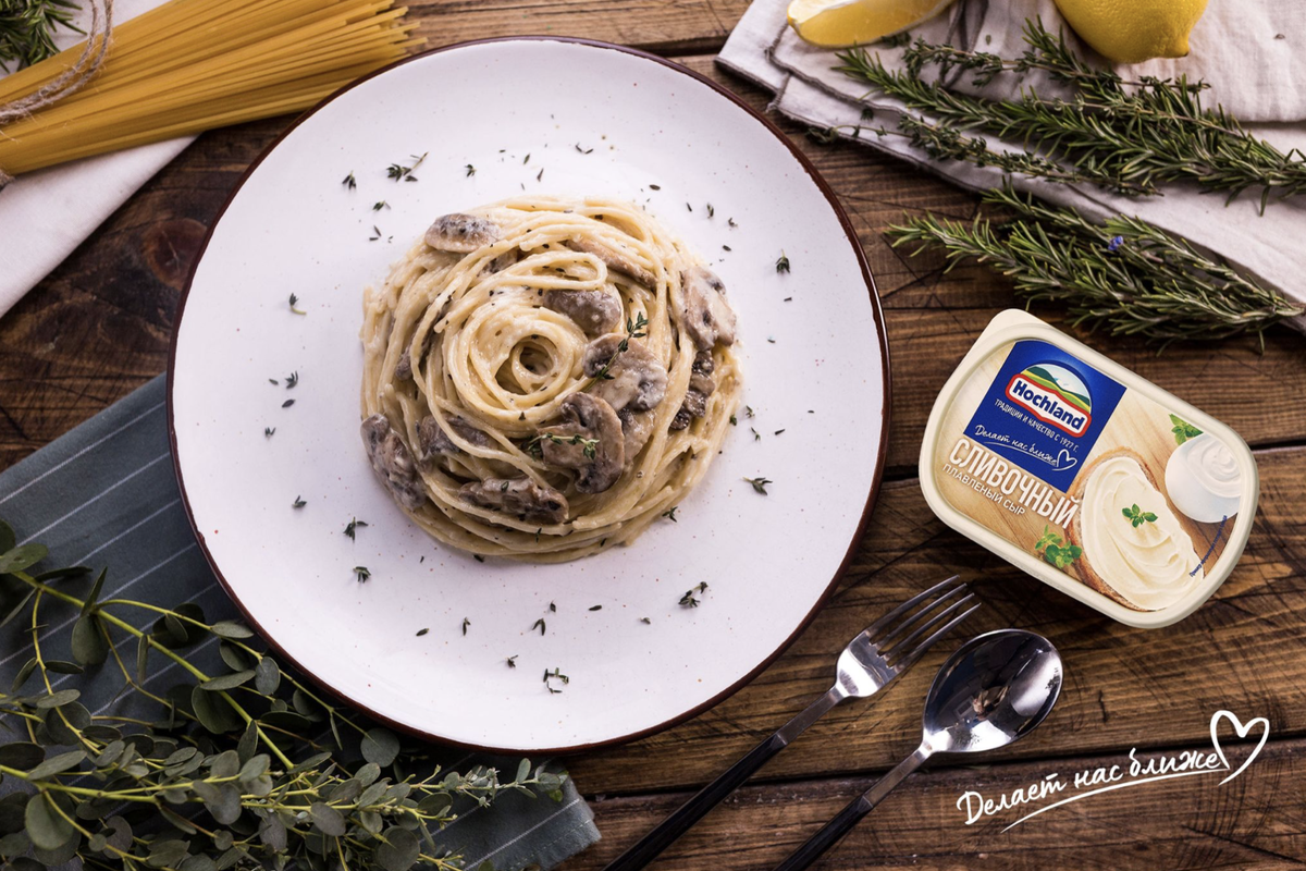 В начале рабочей недели важно позаботиться о том, чтобы ужин был сытным, но относительно легким. Чтобы не нагружать себя на ночь перевариванием тяжелых продуктов вроде мяса, дать организму отдохнуть перед новым рабочим днем, но при этом вкусно поесть и насытиться. Таким блюдом, безусловно, будет паста с грибами в сливочно-сырном соусе. Грибы богаты растительным белком и насытят не хуже мяса, а соус, приготовленный на основе плавленого сыра Hochland “Сливочный” и нескольких весьма пикантных ингредиентов, придаст пасте необыкновенный сливочный вкус с примесью итальянских трав и горчицы. Соус, благодаря кремовой текстуре плавленого сыра Hochland, получается однородным, без комочков. ИНГРЕДИЕНТЫ: ПРИГОТОВЛЕНИЕ: Вам понравился рецепт? Еще больше вариантов сытных немясных блюд смотрите на сайте Hochland.ru.