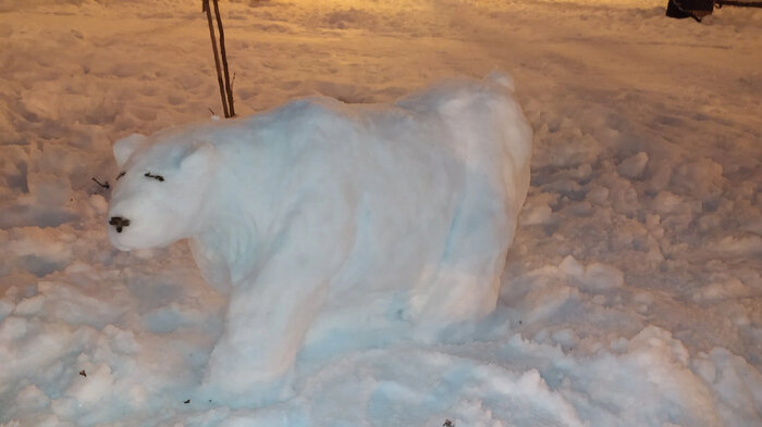 Видела, выкладывают тут честно стыренные и искусственно созданные фото снежных фигур. И решила поделиться своим скромным творчеством. Я не скульптор и не художник, леплю для души, потому что руки "чешутся". Греет душу, что такие "снеговики" задерживаются во дворе дольше обычных. Вот такой белый мишка у меня получился года два назад. Предполагалось, что это будет тигром (в год тигра), но больше похоже на большую кошку. И вот там сзади - это лапа, он на ней лежит! А то знаю я вас)) Лось ради хохмы был, снега на тот момент мало выпало. В прошлом году я всю зиму ждала мокрого снега. В итоге только в марте смогла изобразить символ года - зайца. Погода не часто дарит мокрый снежок да ещё и к выходным. В этом году я уже по взятой привычке слепила символ наступающего года - Дракошу. Вот только за ночь его полило дождем и на следующий день от него и след простыл. На этот раз мне помогал мальчишка лет 11-ти, хвалил мои работы, рассказывал, что уже видел в прошлых годах и хотел знать, кто ж их ма