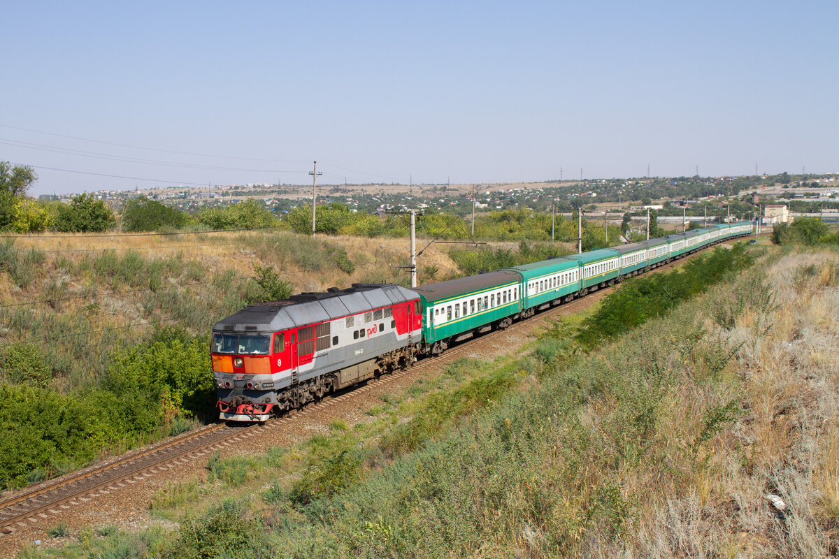 В наш век на железной дороге сложно найти что-то удивительное, но мы попытаемся. И сделать это совсем не сложно: достаточно прилететь в Волгоград, арендовать автомобиль и приехать на железнодорожный перегон Спартановка - пост 6 километр, ведь именно здесь курсирует один из среднеазиатских поездов. Знакомьтесь: Ташкент - Волгоград! 12 нарядных зеленых вагонов Узбекской железной дороги, ну не красота ли? И честно - мне без разницы, каков этот поезд внутри, мне в данном случае гораздо важнее картинка. В день съёмки, 5 августа 2023 года, с тепловозом не повезло: в голове поезда стоял ТЭП70-0416 в корпоративных цветах РЖД, на морде которого маляры не забыли нарисовать два неказистых прямоугольника.