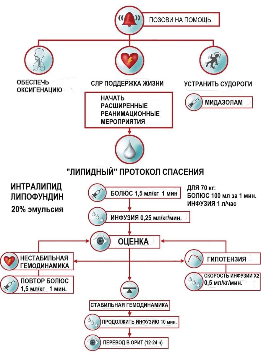 4. Эмульсия липидов 20%. Механизм: перемещение липофильной фракции бупивакаина в эмульсию (гипотеза липидного резервуара). Также липидная эмульсия способствует восстановлению содержания АТФ в миокарде за счет реверсии ингибирующего эффекта местных анестетиков в отношении процессов окисления жирных кислот.