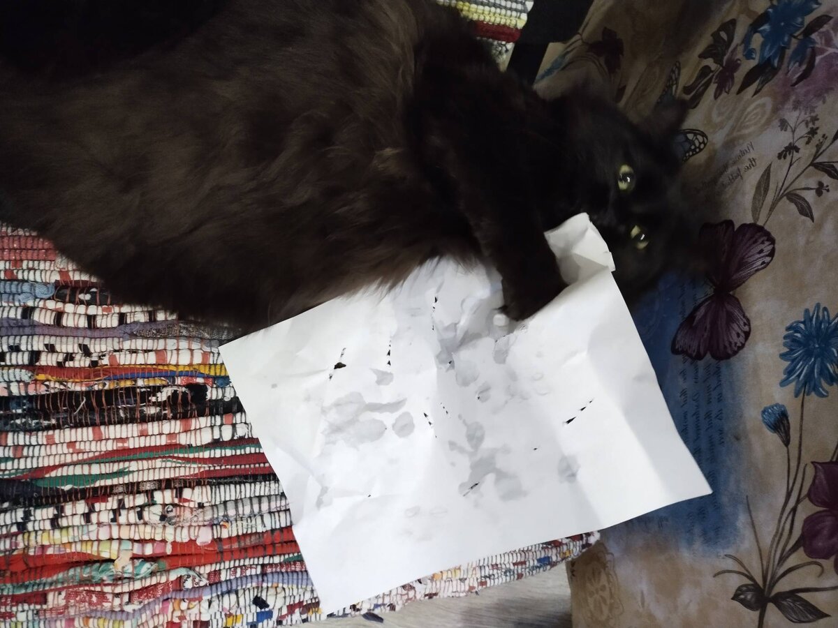 Сегодня я застала своих девок за интересным занятием. Я набрасывала план очередной главы детектива, когда приехал курьер из магазина стройматериалов. Мы с Александром вышли встречать наш ламинат, а кухню я прикрыла, потому что кошки очень боятся чужих. На столе остались листки бумаги, ручка, простой карандаш и пара текстовыделителей. Когда я вернулась в кухню, моя интеллектуальная команда торчала на столе, пишущие приборы были разбросаны (хорошо, не сожраны), а на белом листе виднелись странные следы. Это были отпечатки лапок, множество дырок и, по-моему, размазанный паштет. - Что вы делаете? - я включила строгую маму. - Омно-мно, - откликнулась чёрная тучка, старательно компостируя зубами край листа, - письмо пишем. - Грязными лапами? - Уууу! Урурур! Не грязными а отпечатывательными! Мы ими наполнитель покопали, теперь они печатают. - Это что за перфорация? - поинтересовалась я, глядя на лист А 4 испещренный множественными дырками от когтей. - Омно-мно, это никакая не перфорация, это