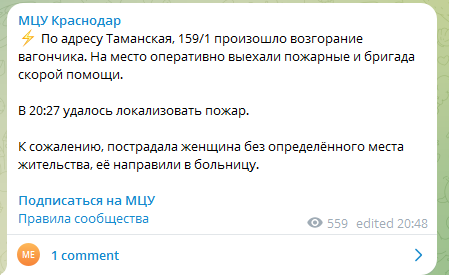 Вечером 18 декабря в вагончике-бытовке на улице Таманской вспыхнул пожар. Возгорание потушили, но в результате происшествия пострадала женщина без определенного места жительства. Видео: тг-канал "Краснодар Телетайп" Возгорание на улице Таманской, по сообщению соцсетей, заметили жители соседнего дома. Они же и вызвали пожарных. Сообщение об инциденте поступило диспетчеру Краснодарского пожарно-спасательного гарнизона в 20:02. Прибывшее на место подразделение установило, что горит вагончик на площади 20 квадратных метров. Огонь удалось оперативно потушить силами 11 человек личного состава МЧС и с привлечением 3 единиц техники. - Кажется, все закончилось хорошо. Надеюсь, что это было какое-то самовозгорание, что жертв нет. Потому что стояли две скорые, обе уехали. Остались две пожарные машины, - комментирует жительница соседнего дома, снявшая видео. – Там еще ходят пожарные, проверяют, светят фонариками. Может быть, что-то дотушивают еще. Идет еще немножечко дым. В 20:31 пожар был полност